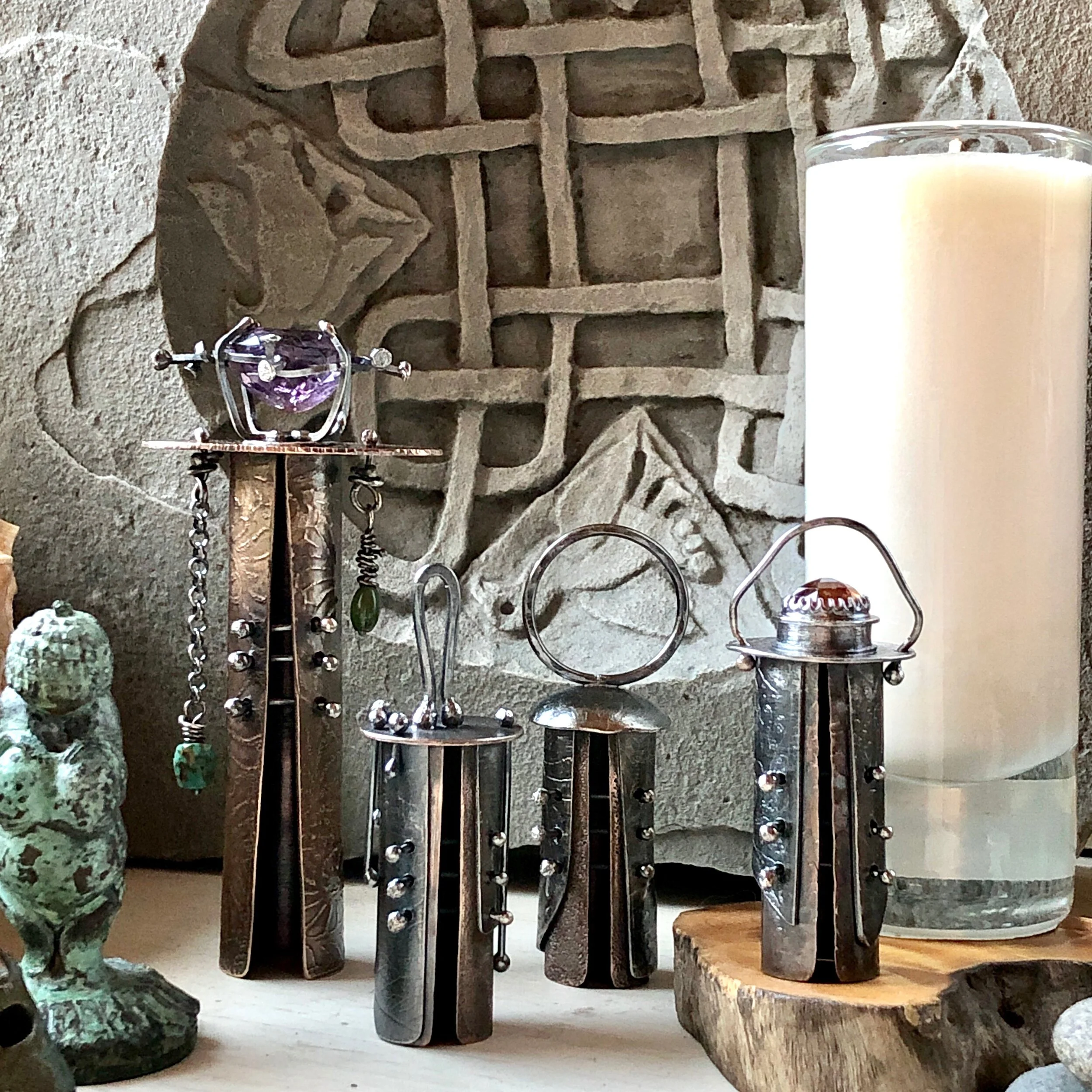 Bronze and Sterling Altar Bell with Amethyst, Turquoise and Smokey Quartz