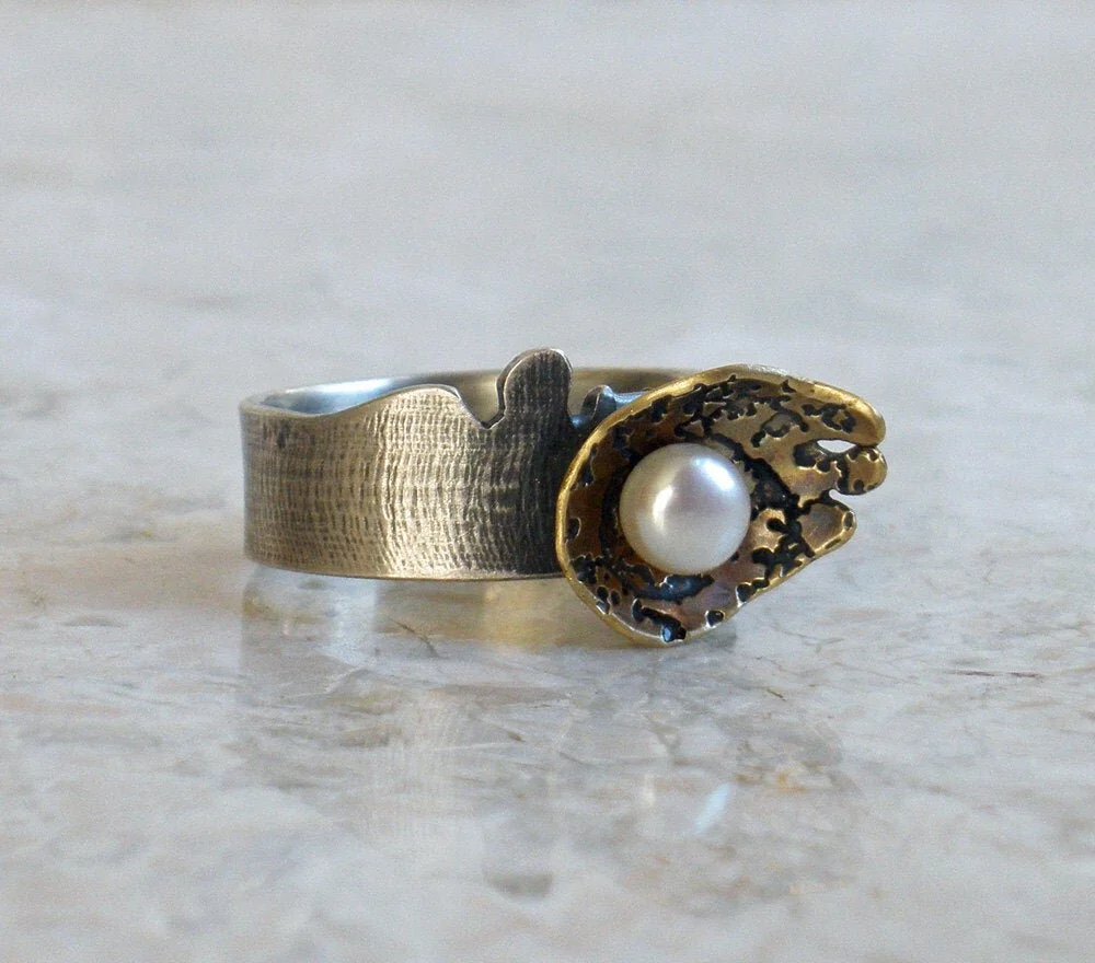 I've textured the wide sterling band with dupioni silk rolled to imprint. The brass shell that holds the pearl has been etched and pierced to an organic shape that echoes the undulations of the band.