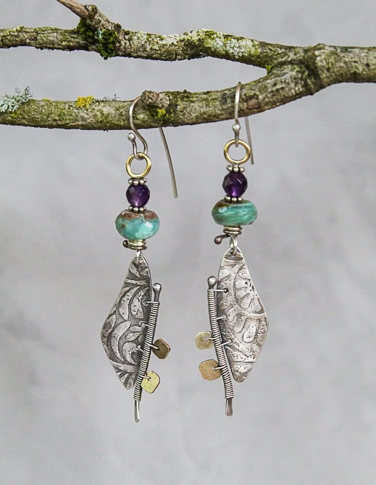 Textured Sterling Earrings with Gold Accents, Peruvian Opal and Amethyst